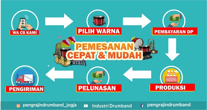 Untuk pemesanannya pun sangat mudah, malahan hanya dengan ponsel bapak/ibu di rumah saja sudah bisa order peralatan drumband kami. Memesan produk kami semudah mengakses media sosial. bapak/ibu tinggal kunjungi saja pddrumband.com dan disana sudah ada customer service dari kami yang akan siap membantu anda melakukan pembelian.