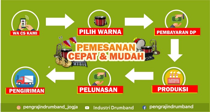 Anda bisa memesan produk drumband dari kami dengan cara yang sangat mudah, malahan hanya dengan ponsel kalian di rumah saja sudah dapat memesan alat drumband kami. Order peralatan drumband kami semudah mengakses media sosial. bapak/ibu tinggal mengunjungi website kami pddrumband.com dan disana sudah ada customer service dari kami yang akan siap membantu kalian melakukan pembelian.