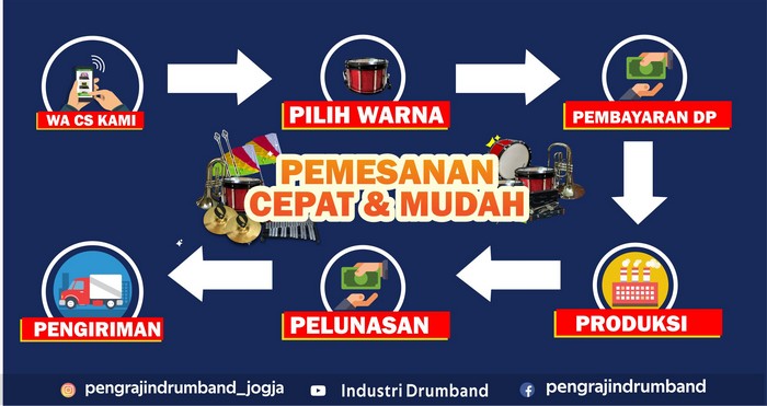 Untuk pemesanannya pun sangat mudah, malahan hanya dengan ponsel anda di rumah saja sudah bisa order produk kami. Memesan alat drumband kami semudah mengakses media sosial. bapak/ibu tinggal kunjungi saja pddrumband.com dan disana sudah ada customer service dari kami yang akan siap memberikan informasi untuk bapak/ibu melakukan pembelian.