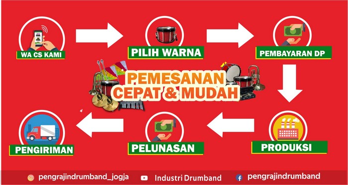 Untuk memesan alat drumband kepada kami pun sangat mudah, bahkan hanya dengan ponsel bapak/ibu di rumah saja sudah bisa order produk kami. Memesan peralatan drumband kami semudah mengakses media sosial. Anda tinggal kunjungi saja pddrumband.com dan disana sudah ada customer service dari kami yang akan siap memberikan informasi untuk kalian melakukan pembelian.